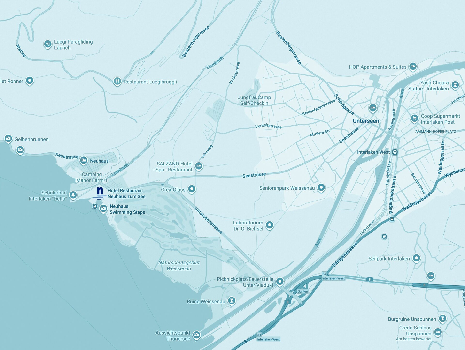 Unser Restaurant liegt am oberen Thunersee, 5 Minuten westlich von Interlaken, ab der A8, Ausfahrt 24 «Interlaken West» Richtung Gunten. Parkplätze sind genügend vorhanden.